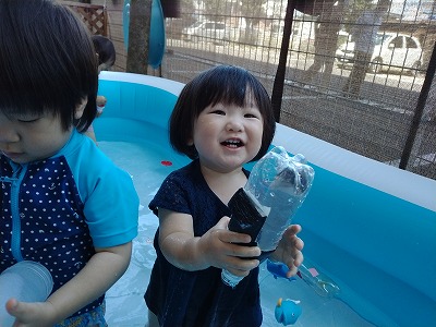 今日のプールでも、ドレッシングボトルの水鉄砲やカニさんポンプなどのおもちゃも使いながら遊びました。